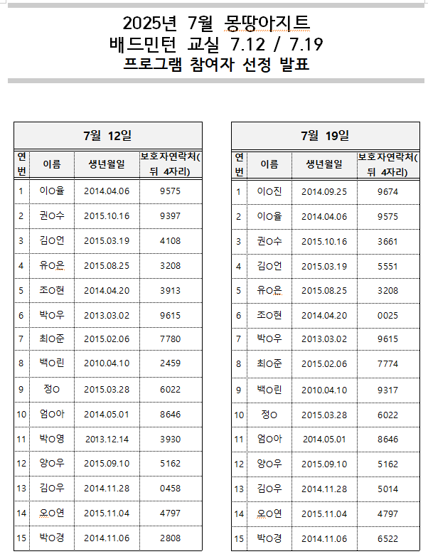 | [ÇÁ·Î±×·¥] 7¿ù ¸ù¶¥¾ÆÁöÆ® »çÀüüÇè [¹èµå¹ÎÅÏ ±³½Ç] Âü¿© È®Á¤ÀÚ ¸í´Ü ¾È³» | ||