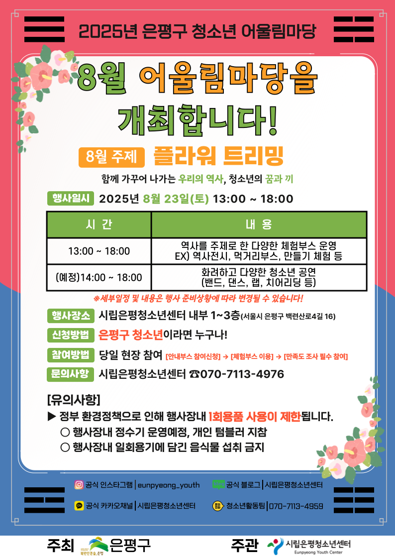 ¡Ø »ç ¾÷ ¸í : 2025³â 8¿ù ÀºÆò±¸ û¼Ò³â ¾î¿ï¸²¸¶´ç 'Çöó¿ö Æ®¸®¹Ö' - ÇÔ²² °¡²Ù¾î ³ª°¡´Â ¿ì¸®ÀÇ ¿ª»ç, û¼Ò³âÀÇ ²Þ°ú ³¢ ¡Ø »ç¾÷ÀϽà : 2025³â 8¿ù 23ÀÏ(Åä) 13½Ã~18½Ã *¼¼ºÎÀÏÁ¤ ¹× ³»¿ëÀº ¿î¿µÁغñ»çÁ¤À¸·Î ÀÎÇØ º¯°æµÉ ¼ö ÀÖ½À´Ï´Ù. ¡Ø»ç¾÷Àå¼Ò : ½Ã¸³ÀºÆòû¼Ò³â¼¾ÅÍ(¼¿ï½Ã ÀºÆò±¸ ¹é·Ã»ê·Î 4±æ 16) ¡ØÂü¿©´ë»ó : ÀºÆò±¸ û¼Ò³â ´©±¸³ª ¡ØÂü¿©¹æ¹ý : ÇöÀå Âü¿© ¡Ø¹®ÀÇ»çÇ× : ½Ã¸³ÀºÆòû¼Ò³â¼¾ÅÍ Ã»¼Ò³âȰµ¿ÆÀ 070-7113-4976 |