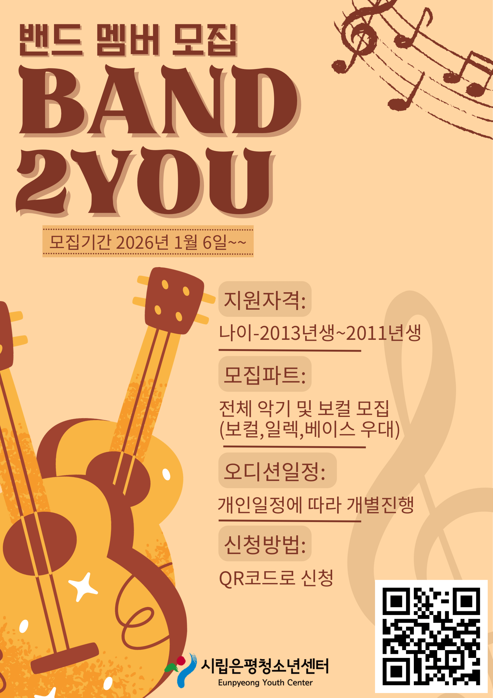 1. µ¿¾Æ¸®¸í : ¹êµåµ¿¾Æ¸® '2YOU' 2. ¸ðÁý±â°£ : 2026.01.01 ~ »ó½Ã 3. ¸ðÁý´ë»ó : Àüü ¾Ç±â ¹× º¸Äà ¸ðÁý(º¸ÄÃ, ÀÏ·º, º£À̽º ¿ì´ë) 4. Ȱµ¿ÇýÅà - ¾Ç±â/¹êµå¿¬½À½Ç Áö¿ø - ´ë¿ÜȰµ¿ Áö¿ø(°ø¿¬ Âü°¡ µî) - ±³À°Áö¿ø 5. ½Åû¹æ¹ý : QRÄÚµå·Î ½Åû *°³ÀÎÀÏÁ¤º° ¿Àµð¼Ç ÁøÇà 6. ¹®ÀÇ»çÇ× : ½Ã¸³ÀºÆòû¼Ò³â¼¾ÅÍ Ã»¼Ò³âȰµ¿ÆÀ ¢Ï070-7113-4976